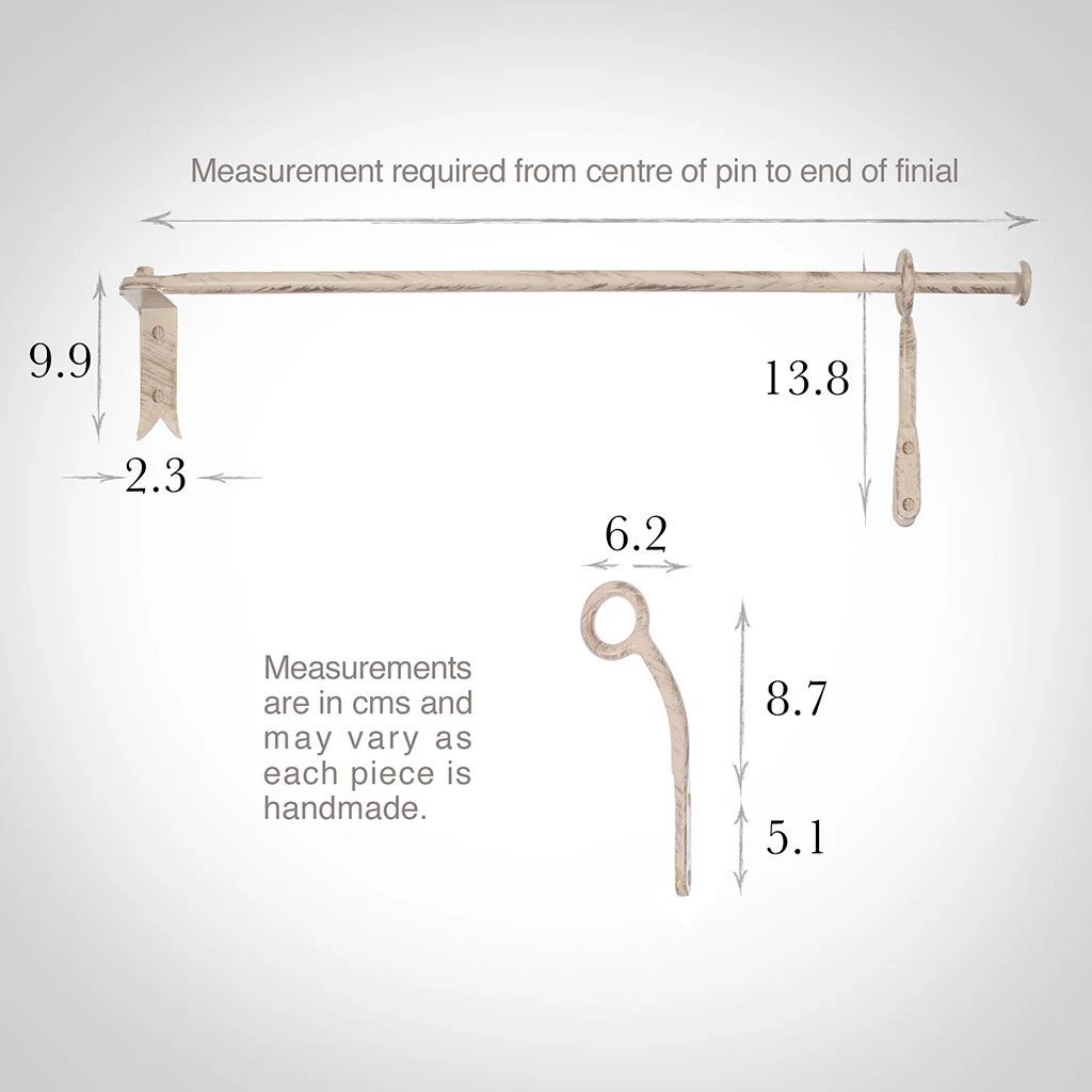 - To ensure your portiere is the correct length, we require the length from the tip of the finial to the centre of the hinge (The hinge is 2cm wide). For help with choosing and measuring your portiere, please read our handy Guide to Portieres in the Jim Lawrence Knowledge Base.