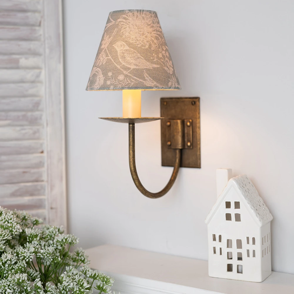 Our gorgeous woodland themed cotton mix fabric in a choice of colourways that weaves soft dusky hues with organic tones and textures. The fabric features a beautiful pattern of intertwining vines, honeysuckle, rose hips and birds etched onto a duck egg background that perfectly encapsulates our agricultural heritage. Our lovely collection of classic candle shades are available in a range of fabrics for creating the perfect finish for your wall lights.