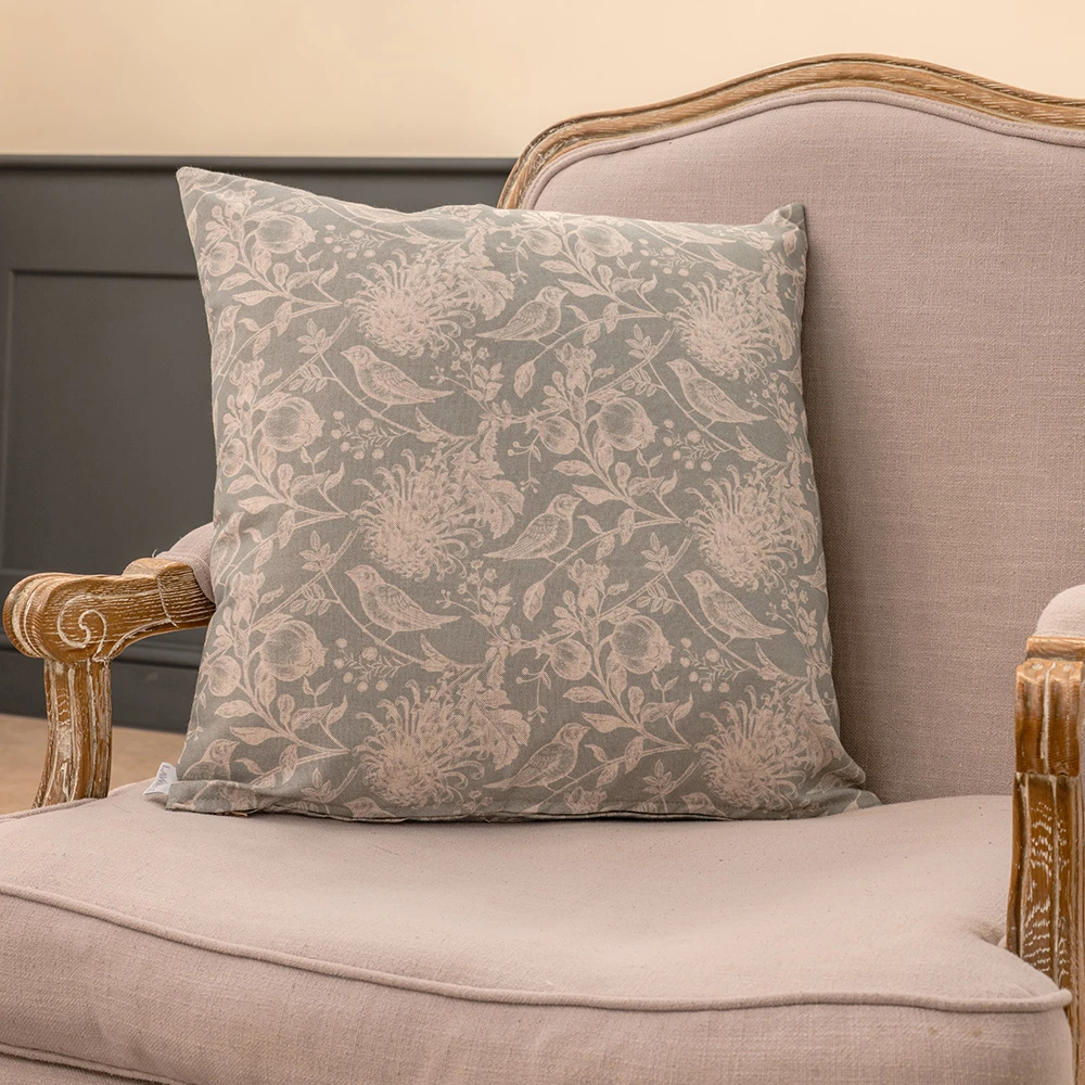 Our gorgeous woodland themed cotton mix fabric in a choice of colourways that weaves soft dusky hues with organic tones and textures. The fabric features a beautiful pattern of intertwining vines, honeysuckle, rose hips and birds etched onto a duck egg background that perfectly encapsulates our agricultural heritage.
