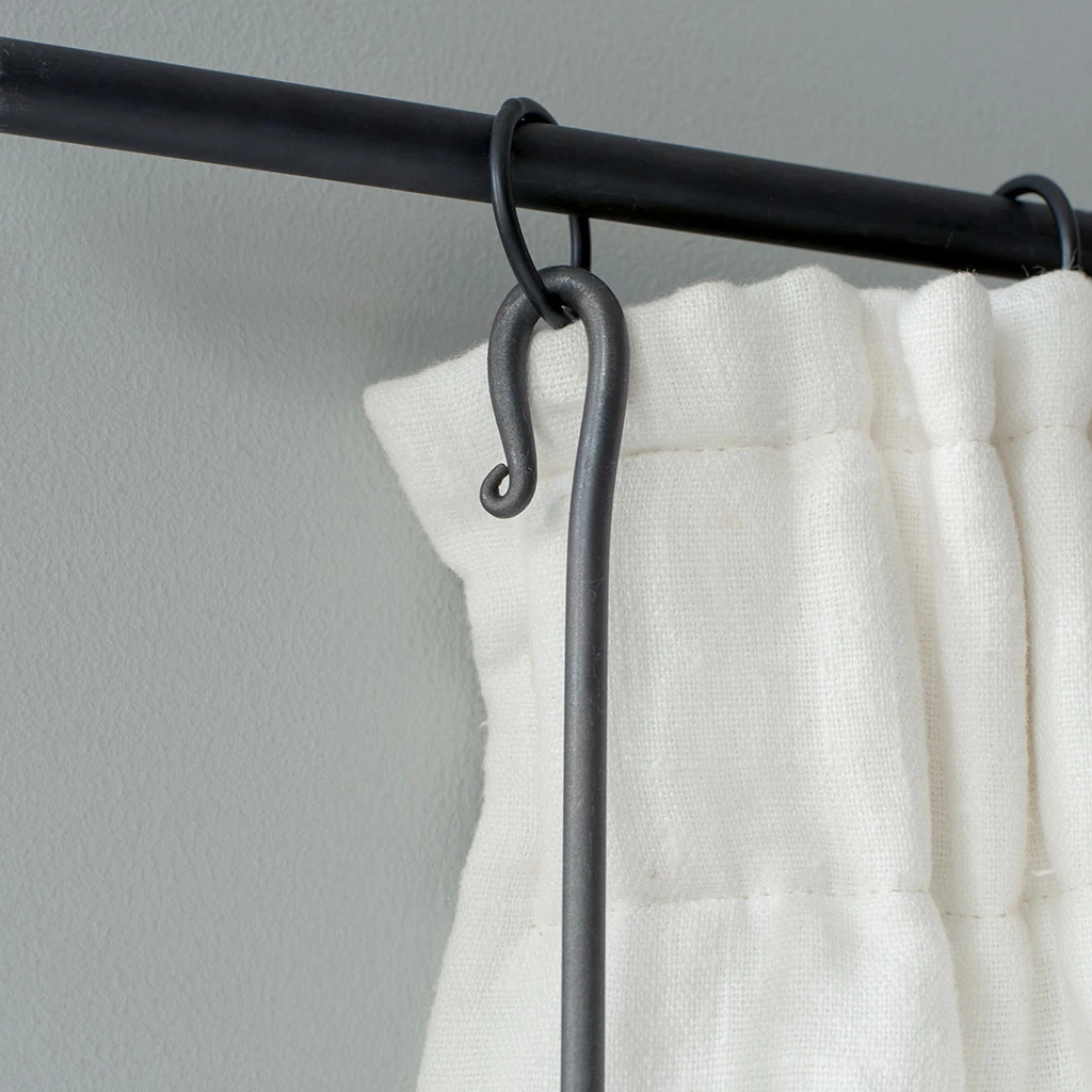 They are designed to hang discreetly behind the curtain edge – the simple forged detail clips very easily to a curtain ring.