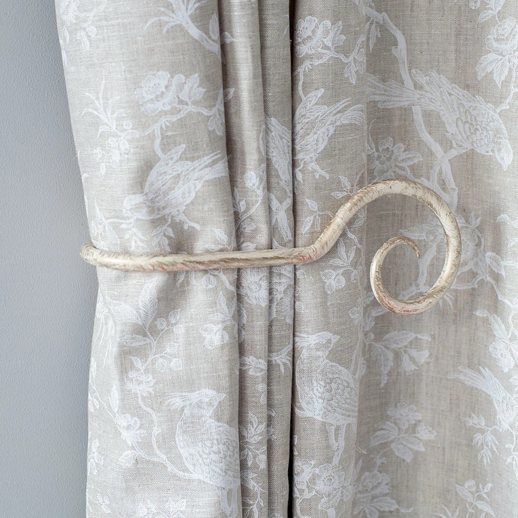This monkey tail style holdback is hand forged and available in a choice of finishes to match your pole. We make the holdback in two sizes: unless your curtain is very light or has no more than a width of fabric we generally recommend this larger size.