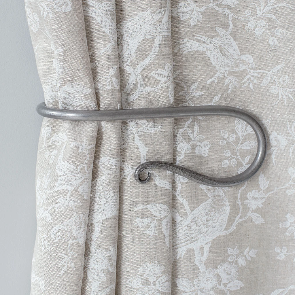 A hand forged, solid steel holdback to match our Shepherd’s Crook finial. The holdbacks are available in two sizes: this larger holdback is generally recommended where there is more than one width of fabric in the curtain (unless it is a very light, unlined fabric).