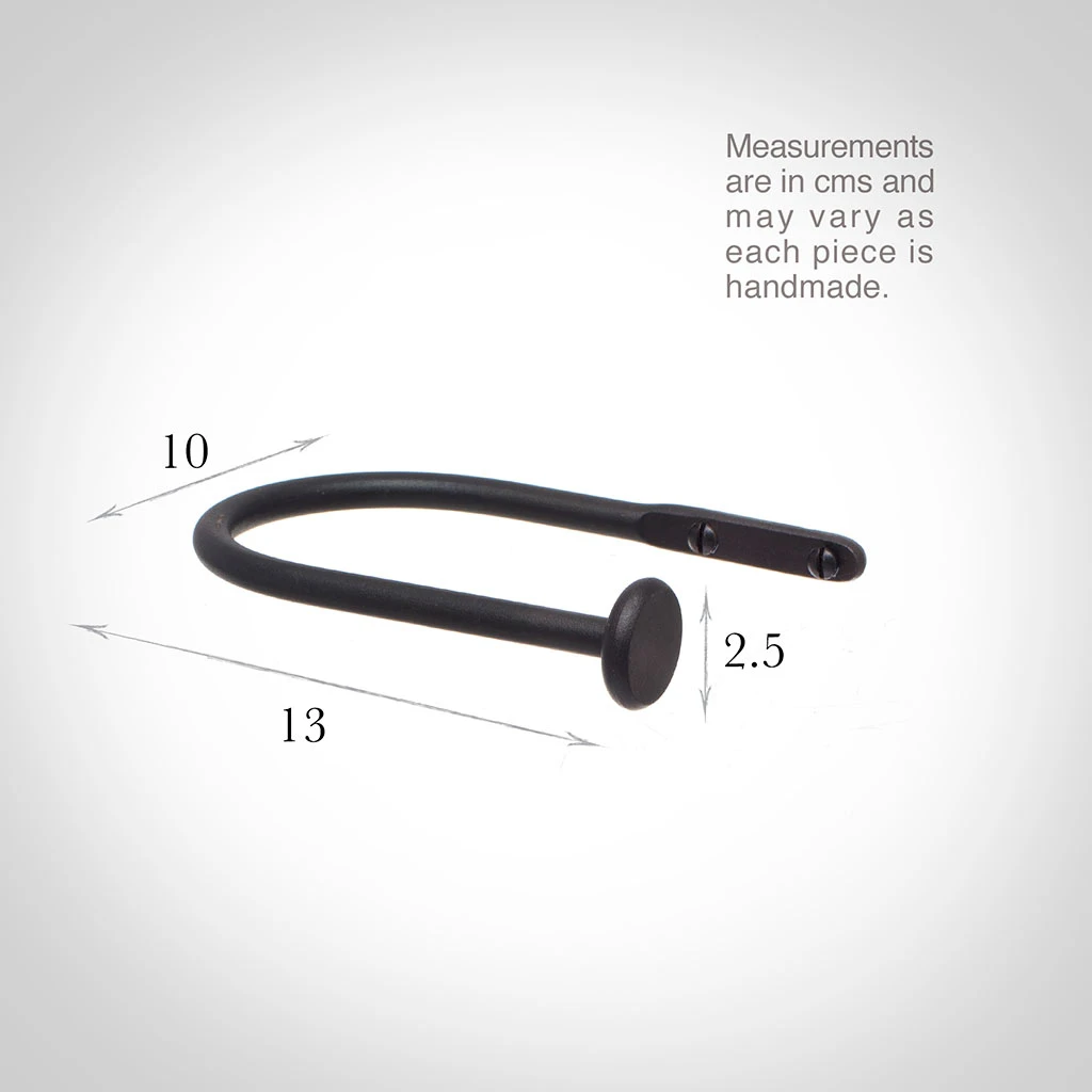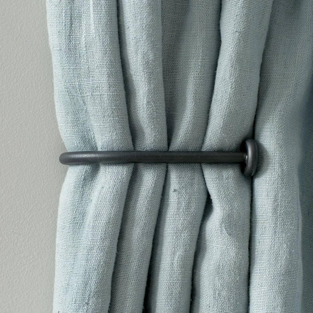 A hand forged, solid steel holdback to match our Button finial. The holdbacks are available in two sizes: this smaller holdback is generally recommended where there is only one width of fabric in the curtain (or more if it is a very light, unlined fabric).