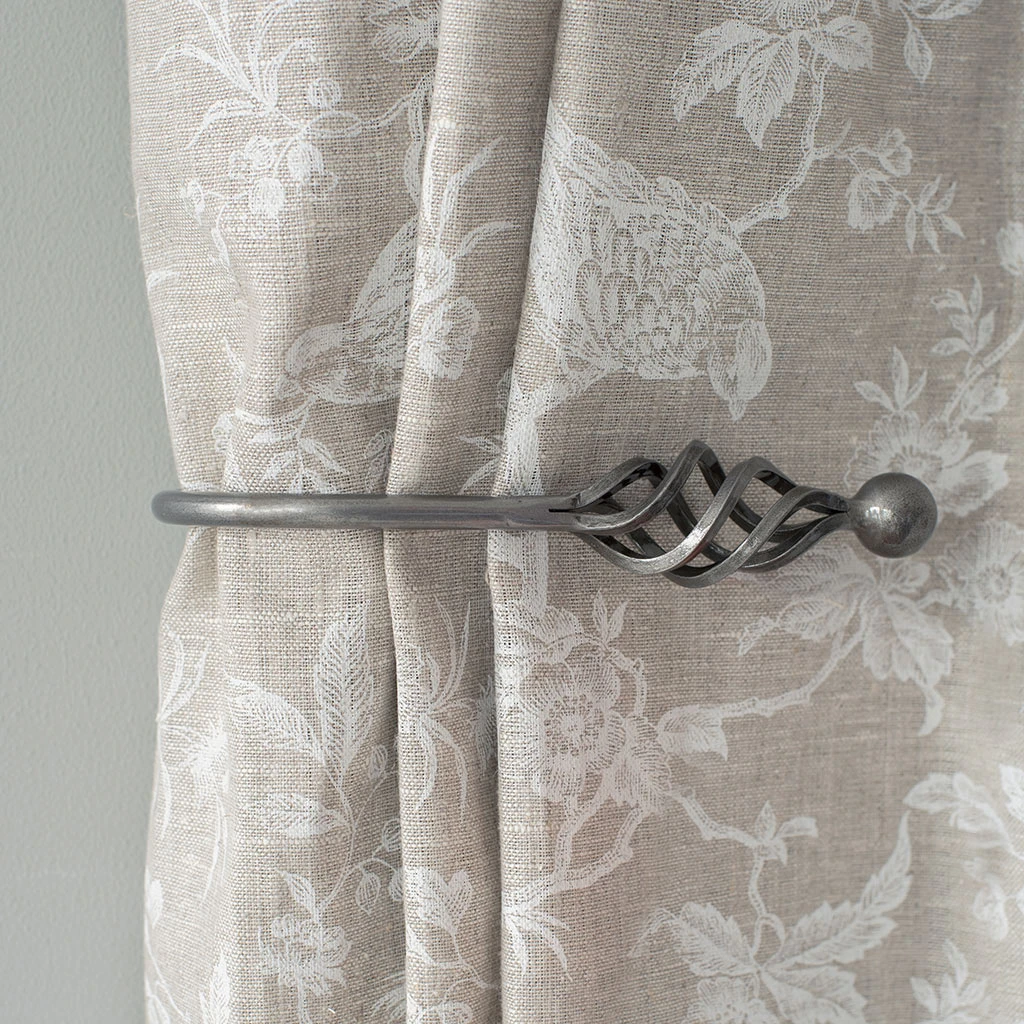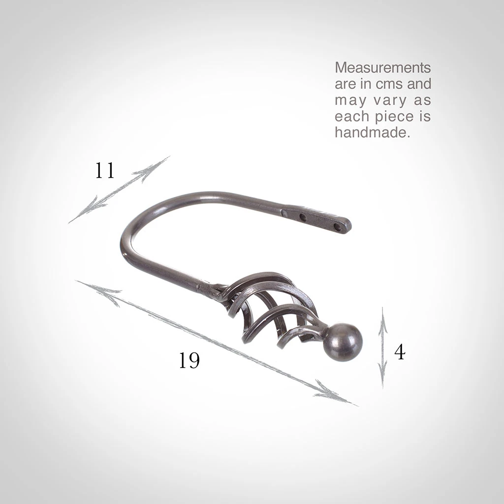 A hand forged, solid steel holdback to match our Cage & Ball finial. The holdbacks are available in two sizes: this smaller holdback is generally recommended where there is only one width of fabric in the curtain (or more if it is a very light, unlined fabric).