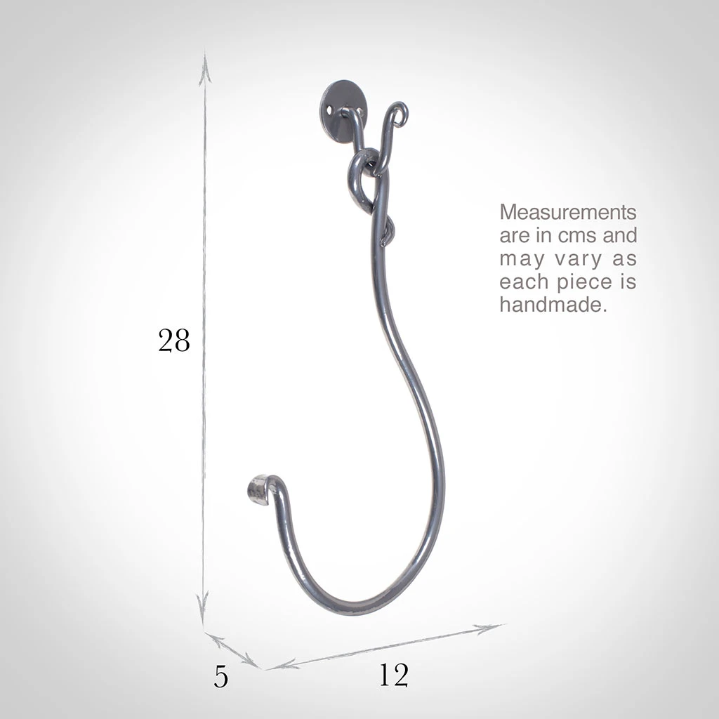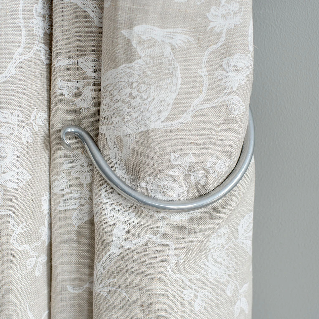 A hand forged holdback which hangs flat against the wall when not in use. The Swing Holdback is available in two sizes and a choice of finishes.